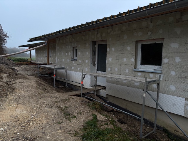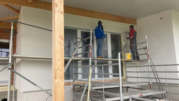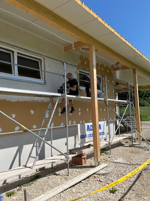 Im Mai wurde die Außenwand der neuen Heimkabine isoliert und verputzt. Diese Maßnahme verbessert nicht nur die Energieeffizienz, sondern verleiht dem Neubau auch ein sauberes Erscheinungsbild.