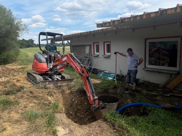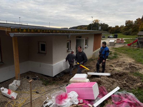 Im Oktober und November standen erneut Baggerarbeiten auf dem Programm. Die Nordseite des Vereinsheims wurde freigelegt, isoliert und teilweise verputzt. Auch ein Teil der Gaststätte auf der Südseite erhielt eine neue Dämmung – insgesamt rund 150 Quadratmeter Isolierung.